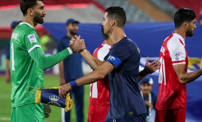 در مراسم ابتدایی بازی، رونالدو که بازوبند کاپیتانی النصریها را به بازو بسته بود در آخر صف بازیکنان پرسپولیس به بیرانوند رسید و با ستاره پرتغالی با خندهای که بر لب داشت به خوش و بشی کوتاه با سنگربان سرخپوشان پرداخت تا نشان دهد به یاد دارد که اولین و آخرین تقابل خود با این سنگربان چه اتفاقاتی رخ داده است و حالا به تهران آمده که اینبار در تقابل با این سنگربان برنده باشد.