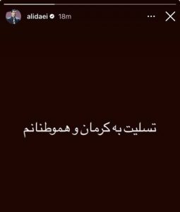 ز برتر ، علی دایی با انتشار استوری در واکنش به حادثه تروریستی کرمان نوشت: تسلیت به مردم کرمان و هموطنانم.